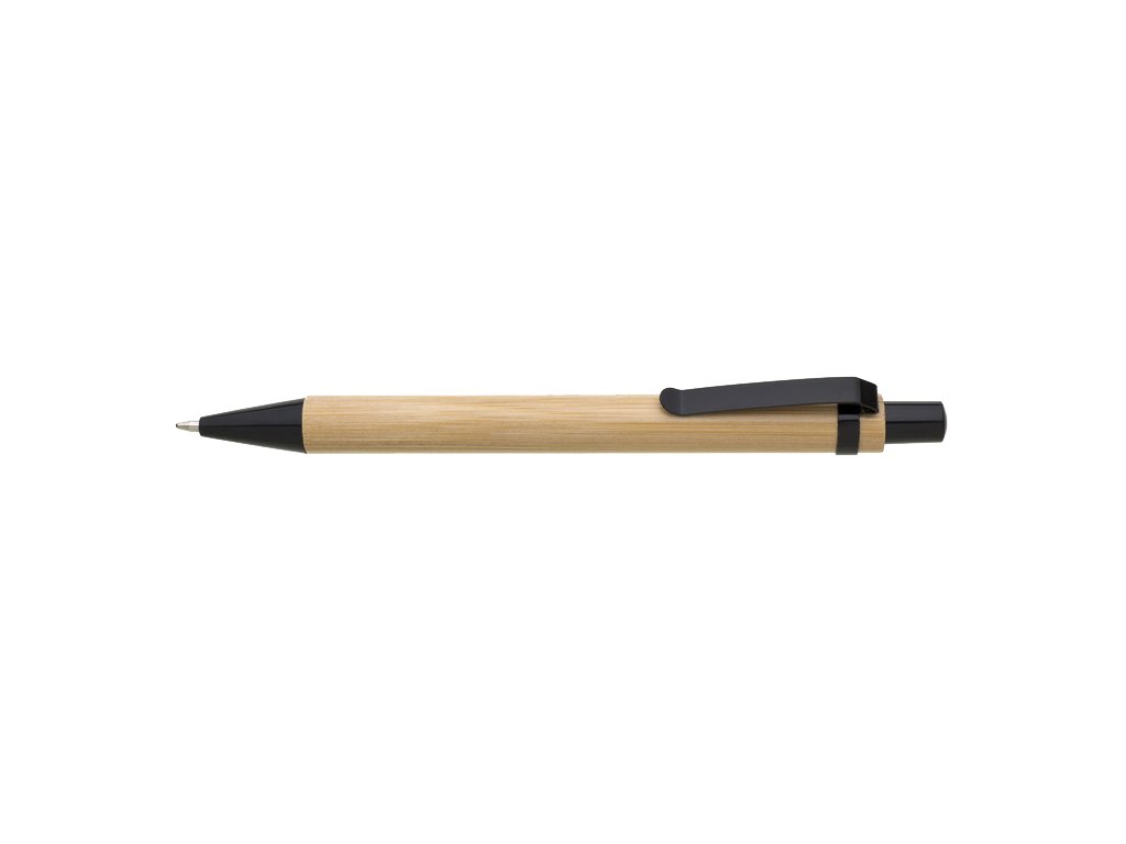 Bambusové tělo propisky je doplněno černými doplňky a černým kovovým klipem. Černě píšící náplň.