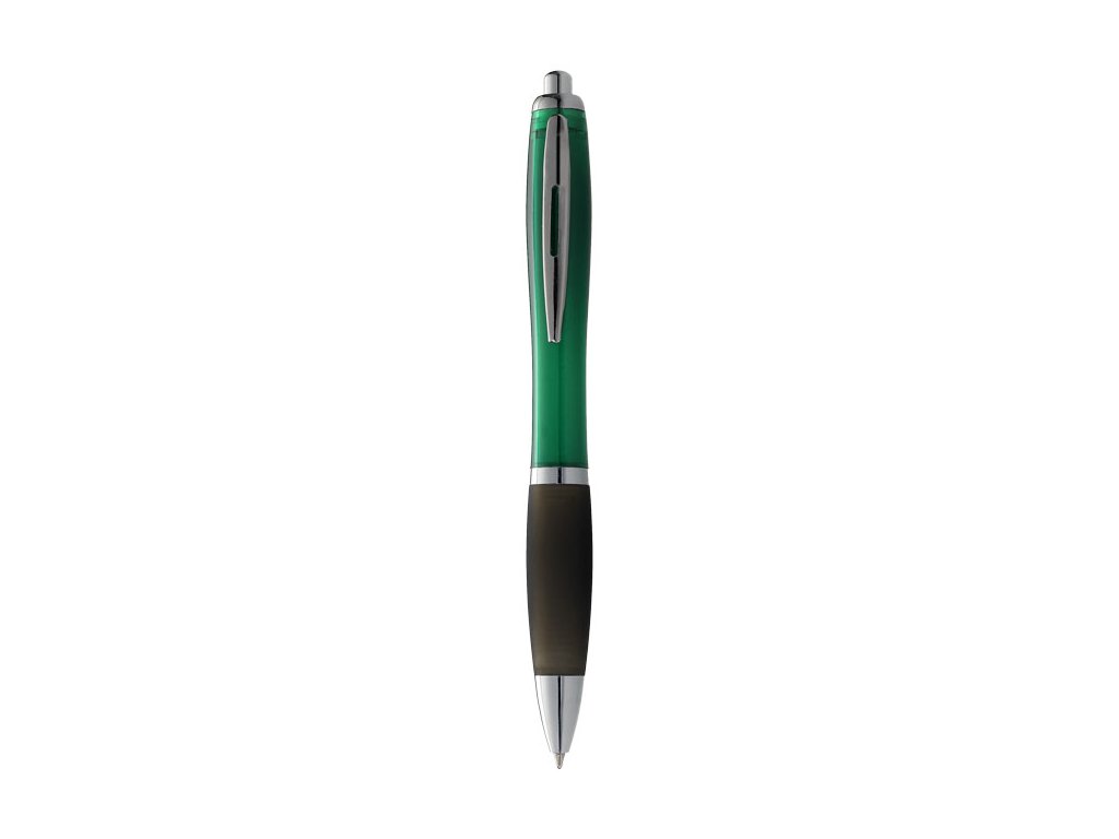 Barevná plastová propiska s černým pogumovaným úchytem.