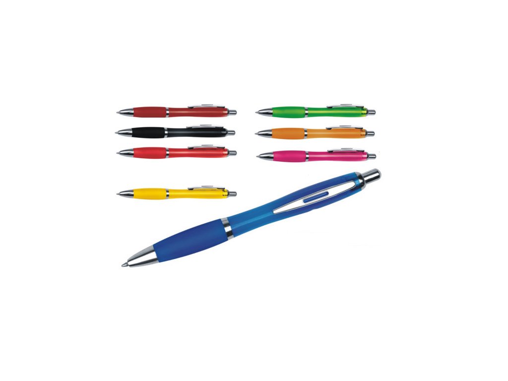 Plastová propisovací tužka s anatomicky tvarovaným gumovým úchopem.