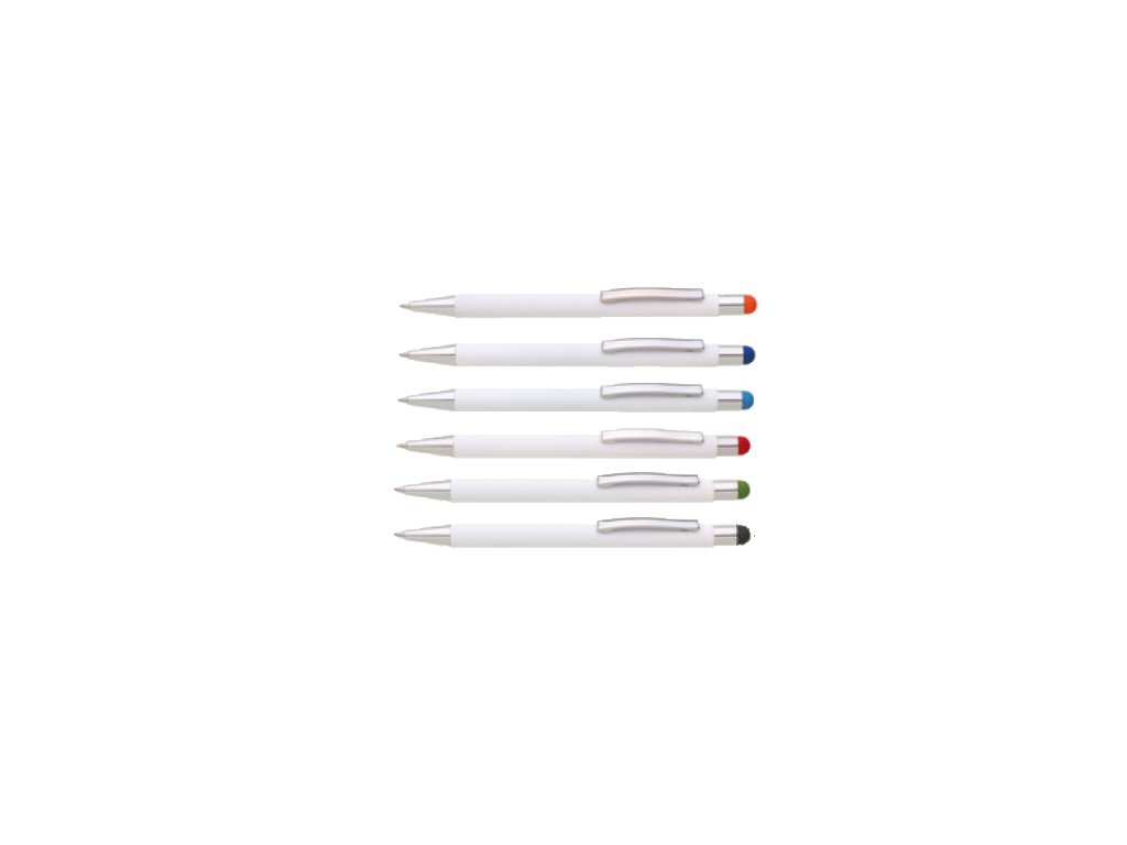 Bílá kovová propiska s barevným touch koncem. Logo po vylaserování je v barvě touch doplňku..