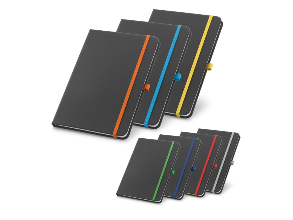 Poznámkový blok A5 s PU pevnou vazbou. Černý s barevnou gumičkou.