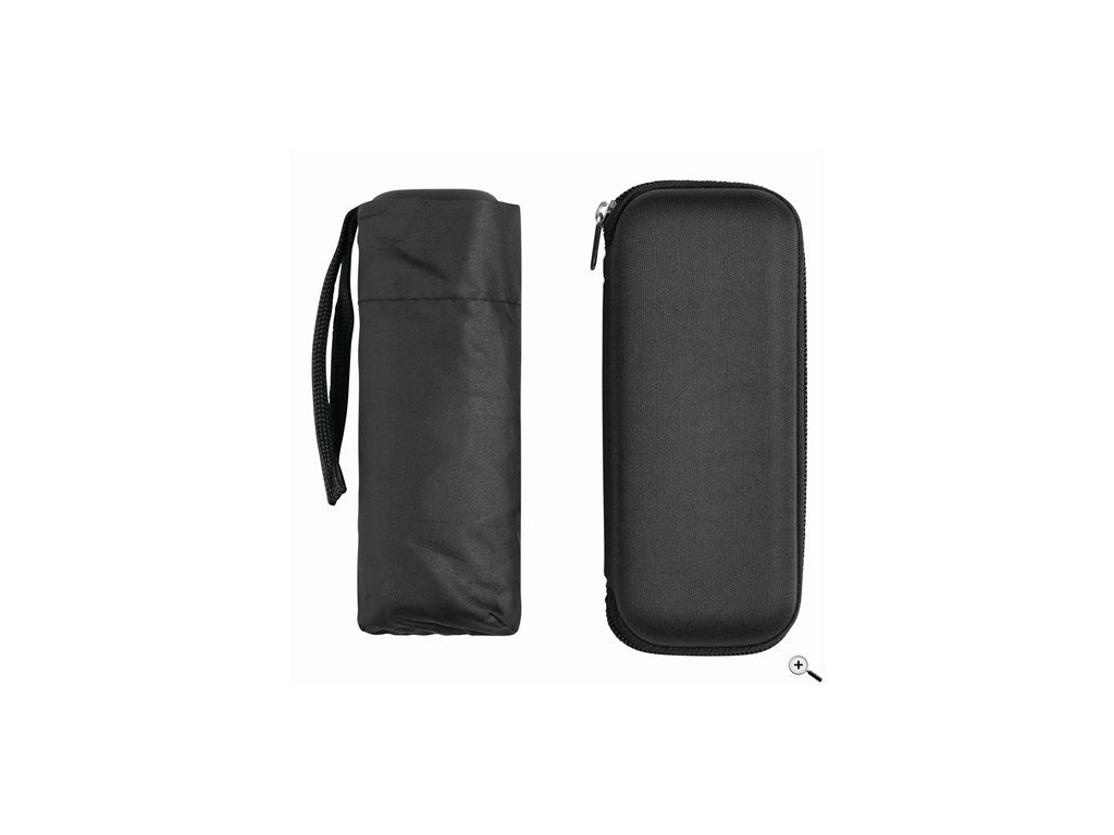 Hliníkový mini deštník s pouzdrem z EVA: lehká konstrukce o hmotnosti 164 g, 5dílný hliníkový shaft s hliníkovými žebry, sklolaminátovými koncovkami a kovovými špičkami, barevně sladěná pogumovaná rukojeť s polyesterovou stříškou