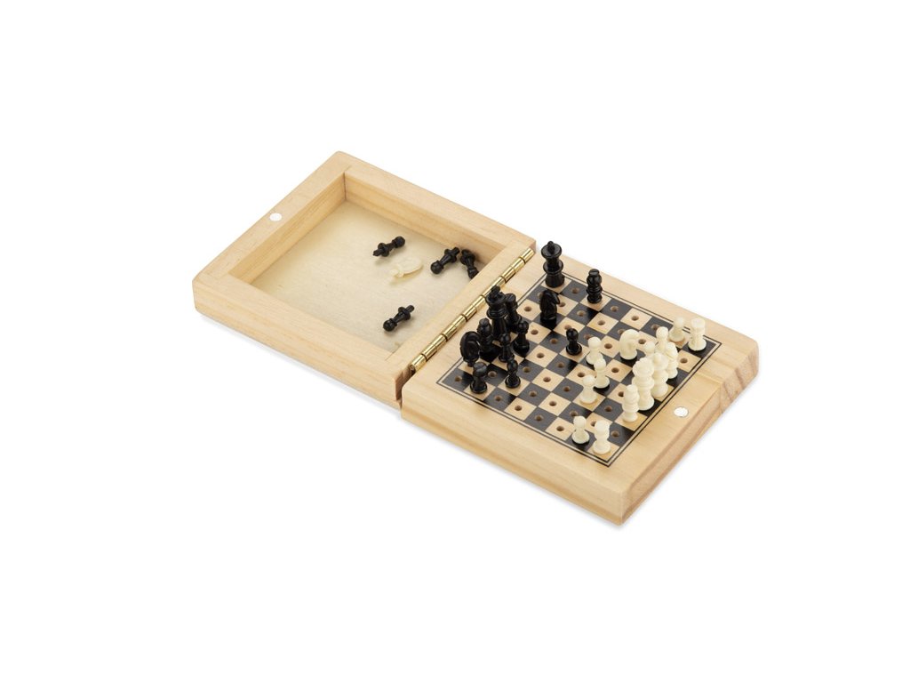 Dřevěné šachy se zasouvacími figurkami, které zajišťují stabilitu během přepravy.