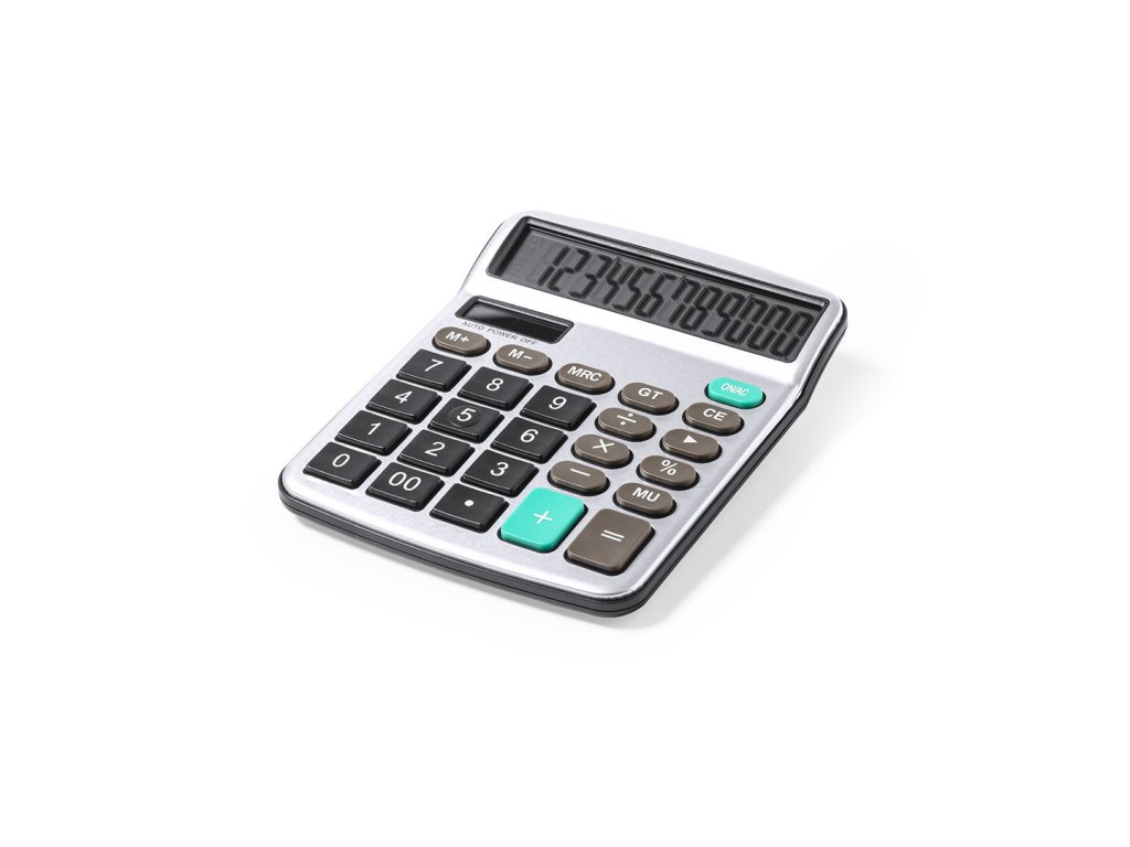 12místná kalkulačka vyrobená z odolného hliníku a ABS, s měkkými klávesami.
