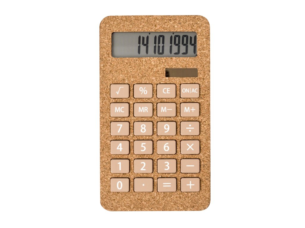 10místná kalkulačka vyrobená z korku. S automatickým vypínacím mechanismem a softtlačítky.