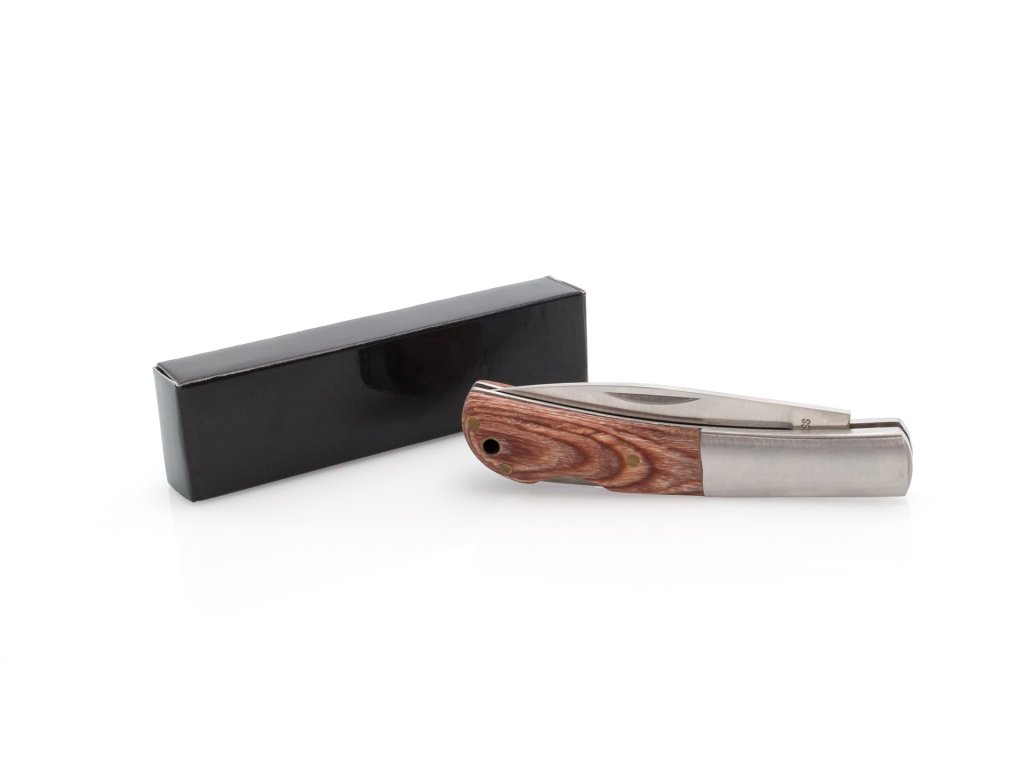 Nůž s čepelí z nerezové oceli a rukojetí z kombinace přírodního dřeva s nerezovou ocelí. Bezpečnostní zámek.