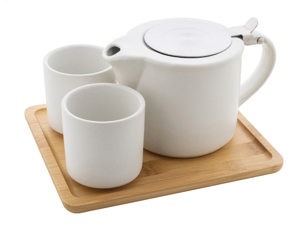 Printek3D keramická čajová sada s bambusovým podnosem - bílá