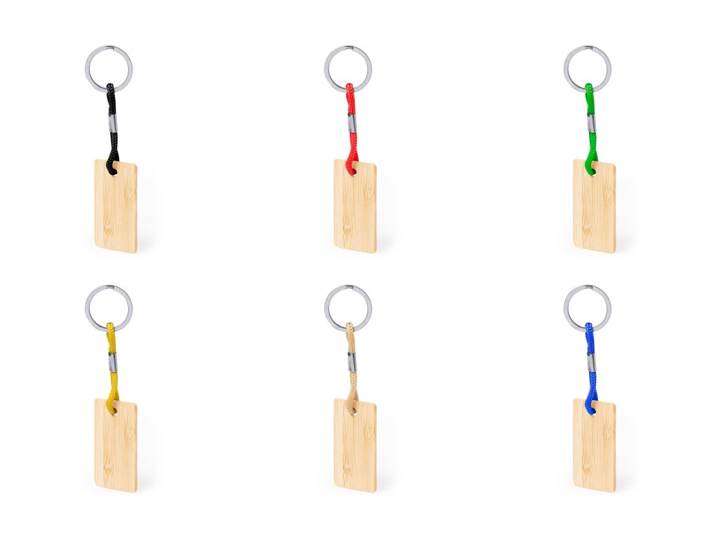 Praktická obdélníková přívěšek na klíče, vyrobený z bambusu, se šňůrkou v různých barvách.