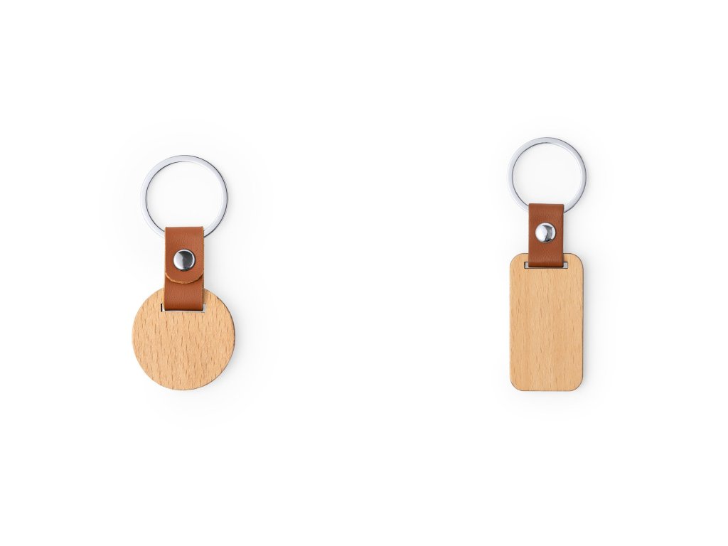 Přívěšek na klíče z přírodního dřeva, s originální hnědou stuhou z umělé kůže a chromovaným nýtem.
