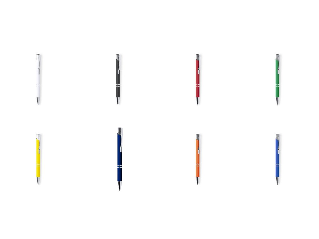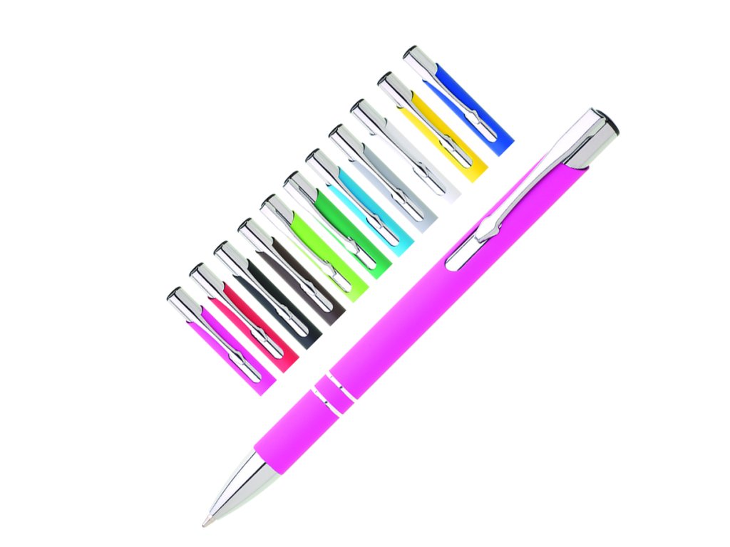 Hliníková propiska se stříbrnými doplňky a měkkým pogumovaným soft povrchem.