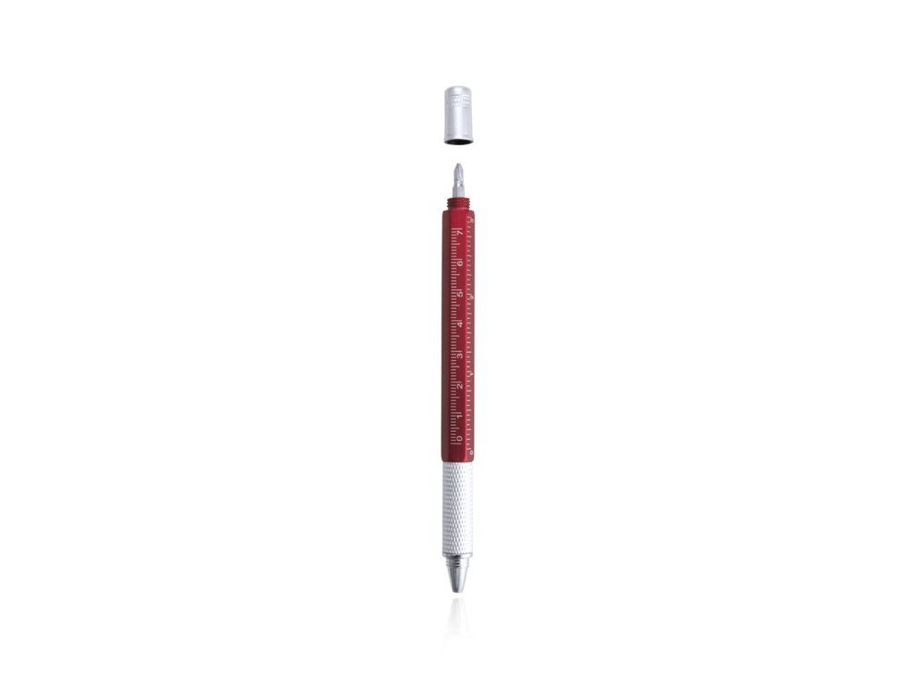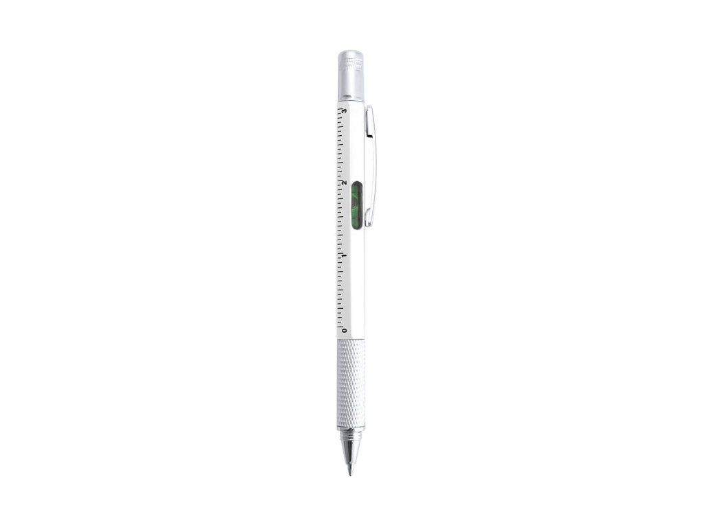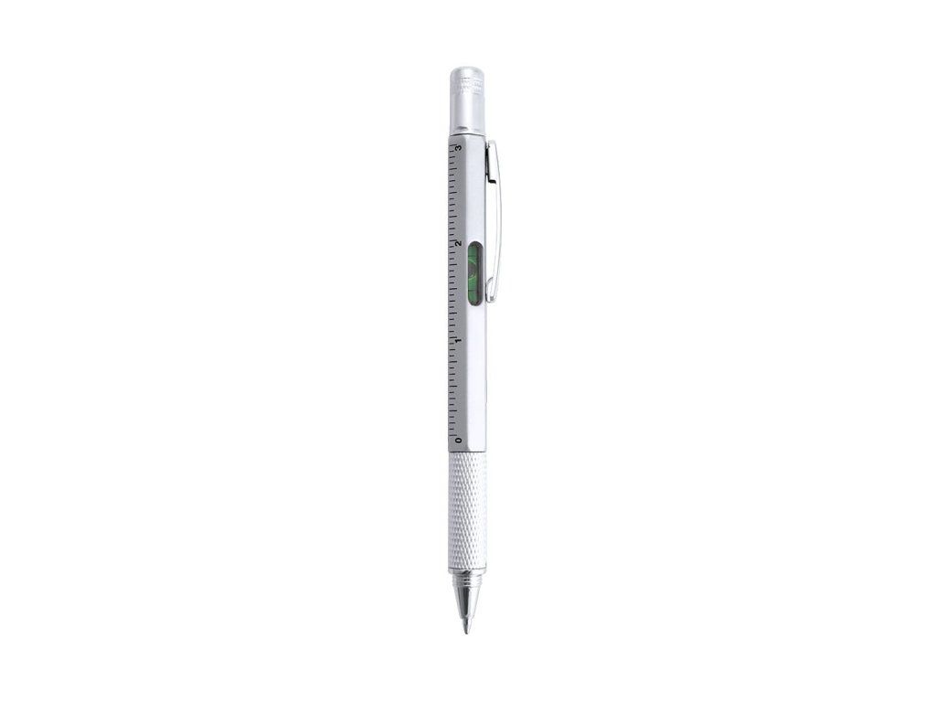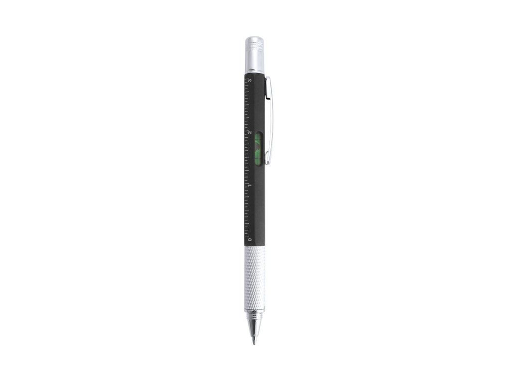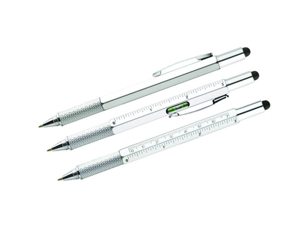 Multifunkční kuličkové pero. Na těle předmětu jsou 2 míry(centimetry, palce) a vodováha.