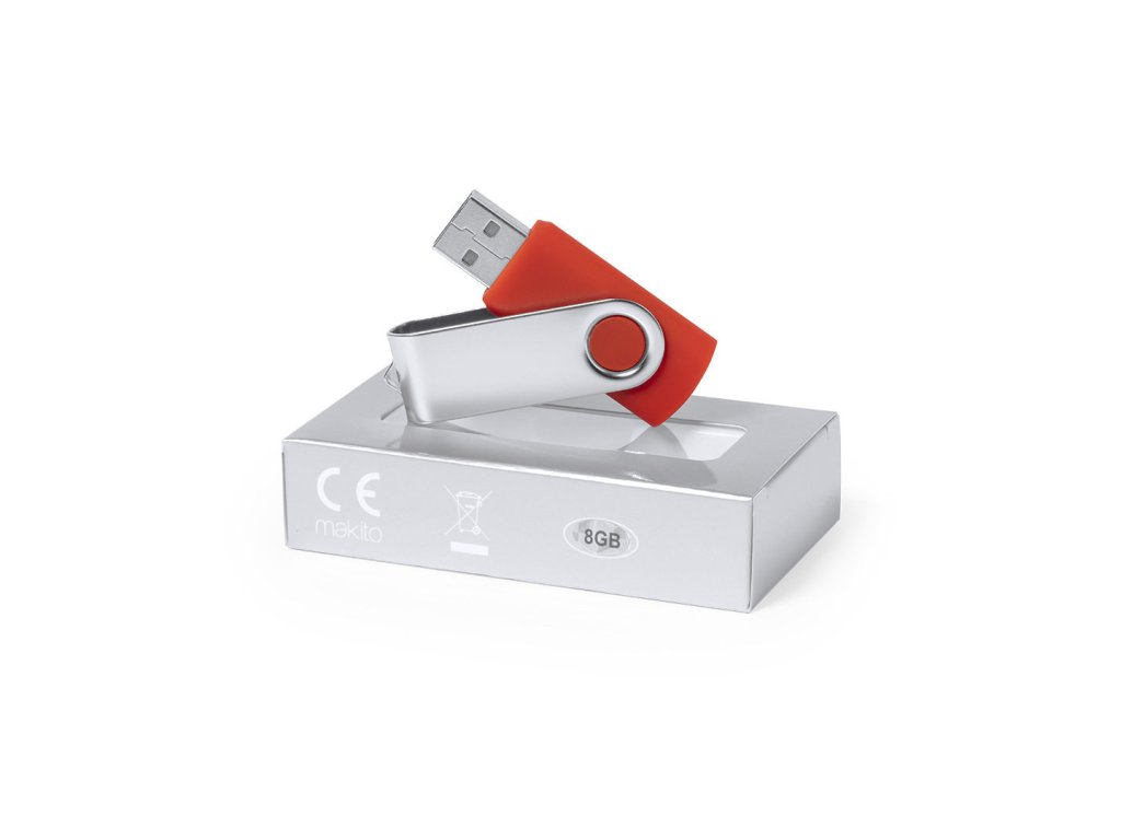 Flashdisk s otočným mechanismem a tělem s měkkou povrchovou úpravou ABS a kovovým klipem.