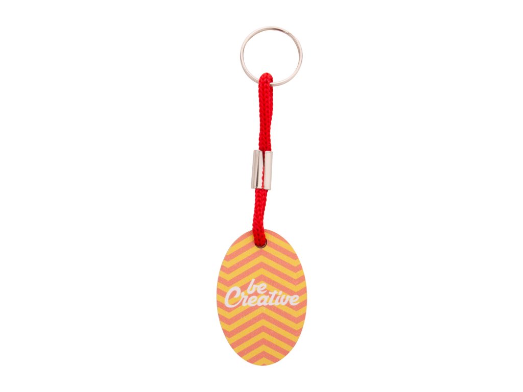 Oválný přívěsek na klíče z březové překližky s barevným polyesterovým páskem a plnobarevným potiskem. Cena je včetně UV LED tisku na jedné straně, nezahrnuje tiskovou přípravu. Min. mn.: 200 ks.