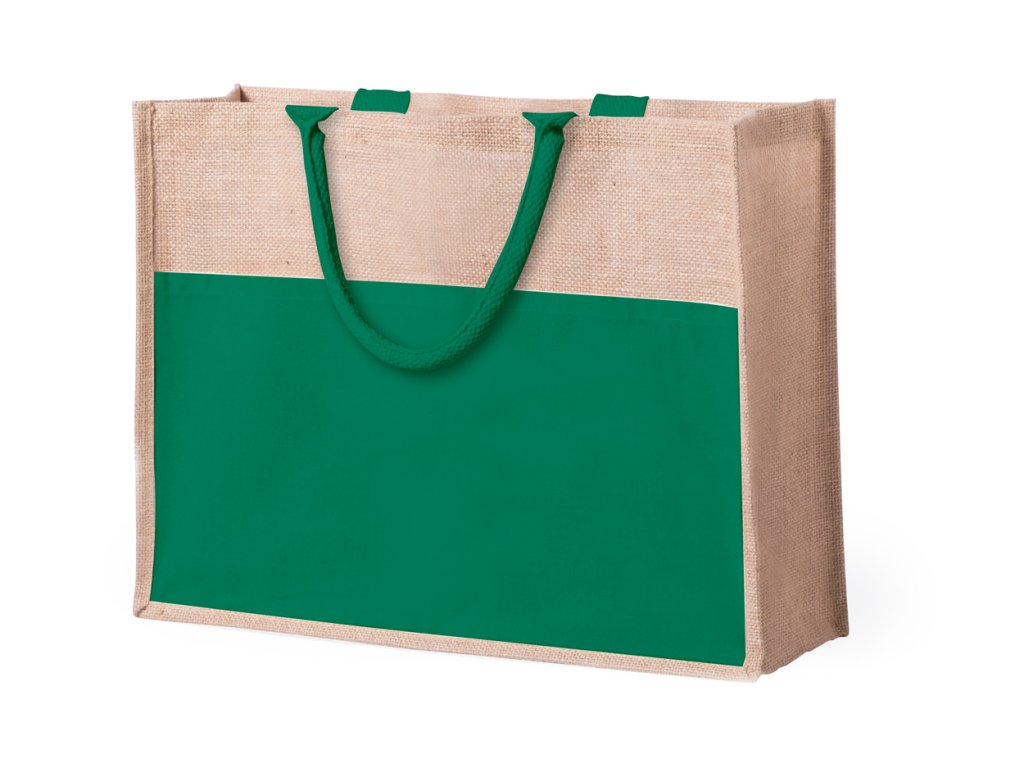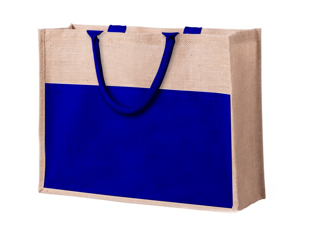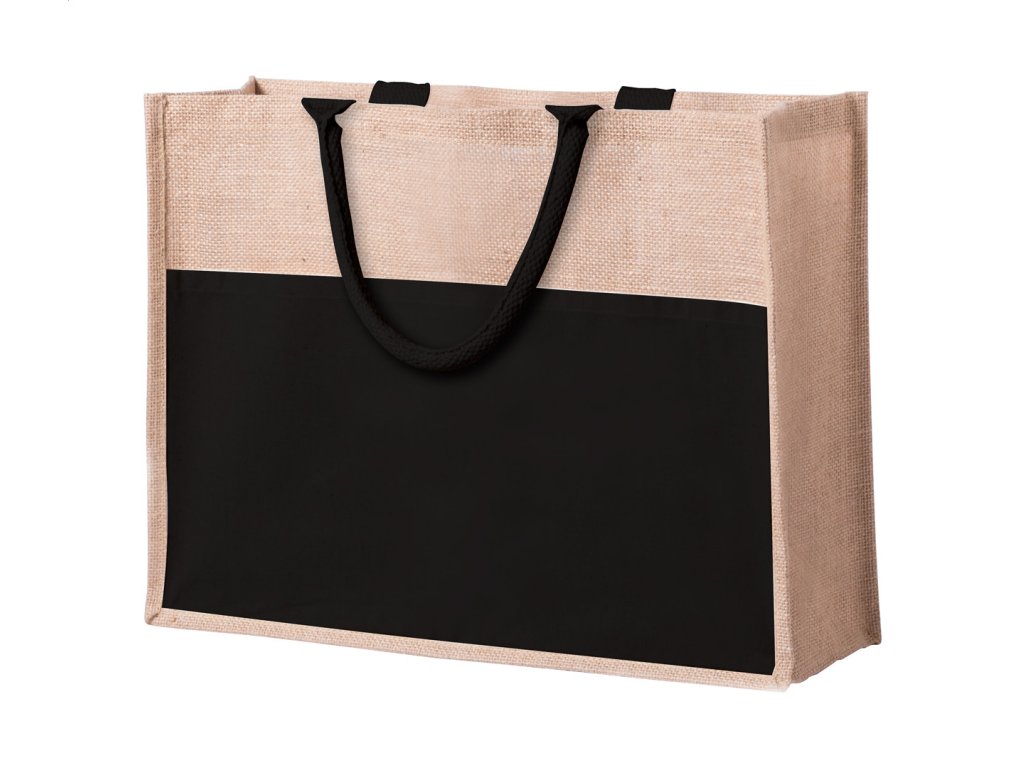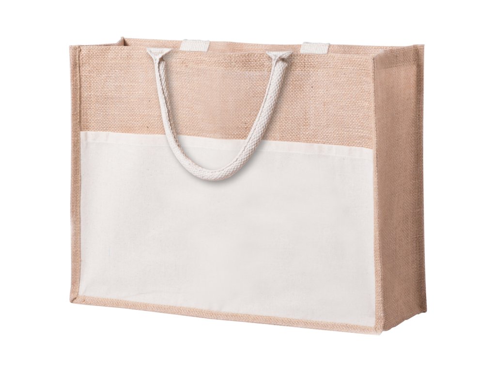 Plážová taška z laminované juty s bavlněnými uchy a přední kapsou.