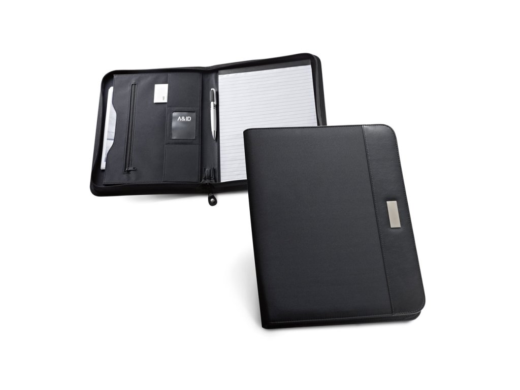Složka A4 z PU a mikrovlákna s několika vnitřními kapsami, blokem na 20 linkovaných listů, držákem na pero (není součástí balení) a zapínání na zip. K dispozici je deska pro přizpůsobení. 245 x 325 x 40 mm | Štítek: 16 x 45 mm