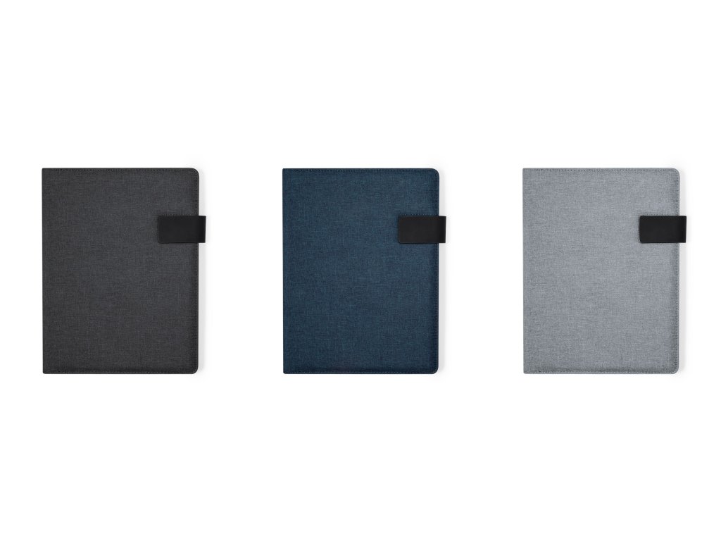 Praktická složka z RPET 600D. Vnitřek obsahuje přihrádky na 4 karty, 3 elastické kapsy na mobilní zařízení a prostor pro listy papíru.