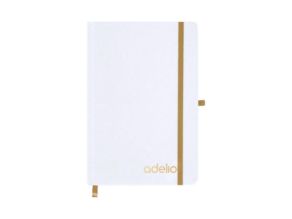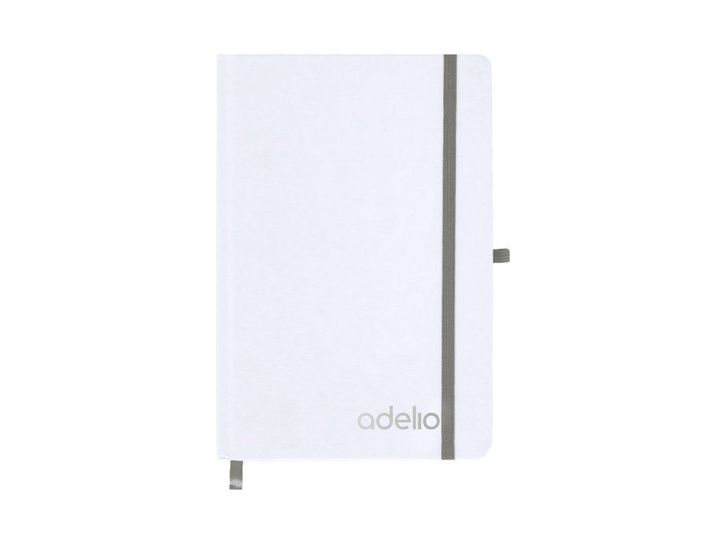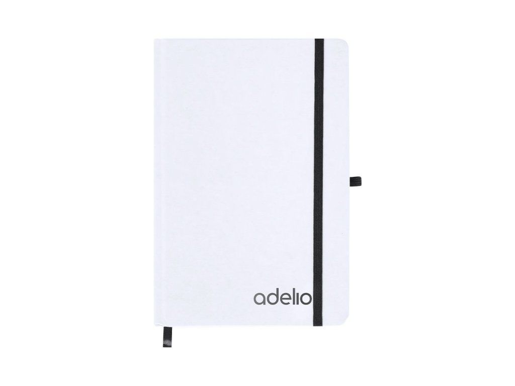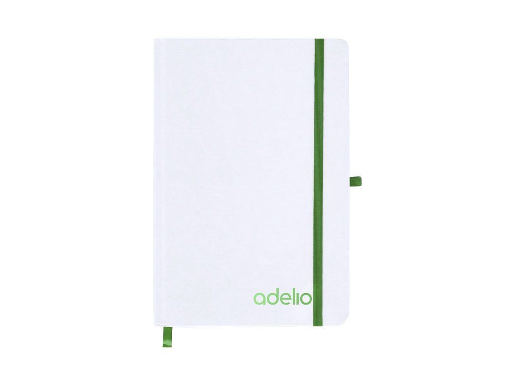 Poznámkový blok s pevnými bílými deskami z recyklovaného kartonu.