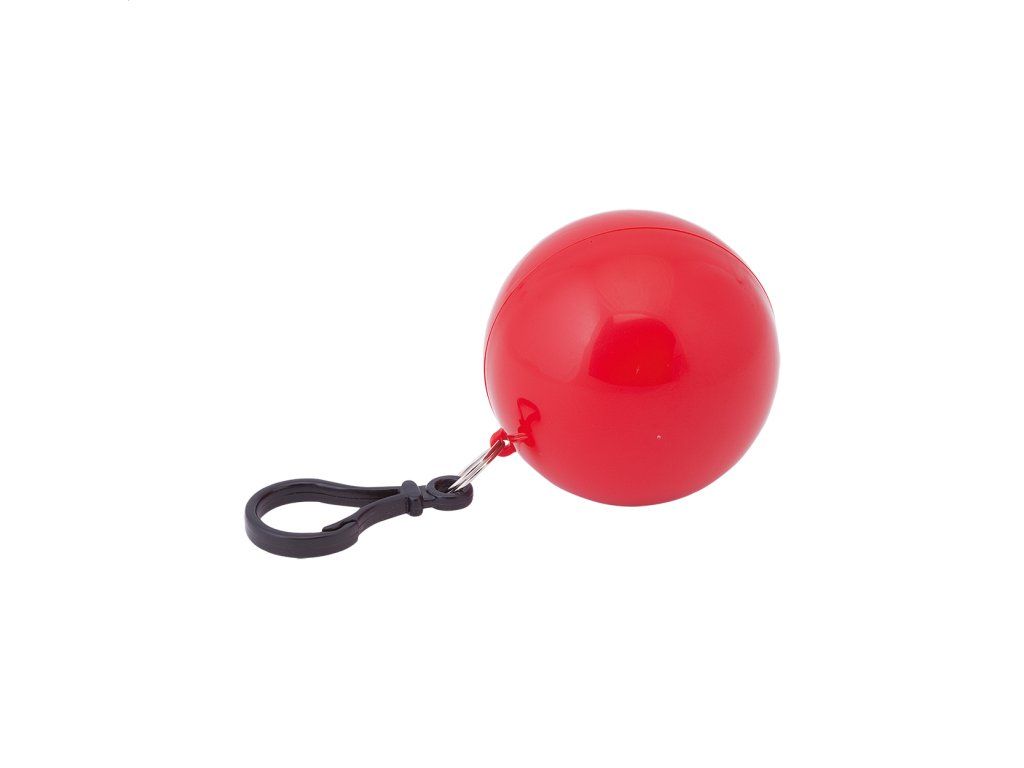 Poncho (pláštěnka) v krabičce s přívěškem na klíče ve tvaru koule.