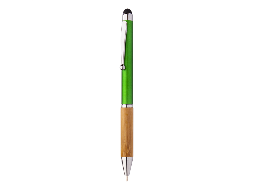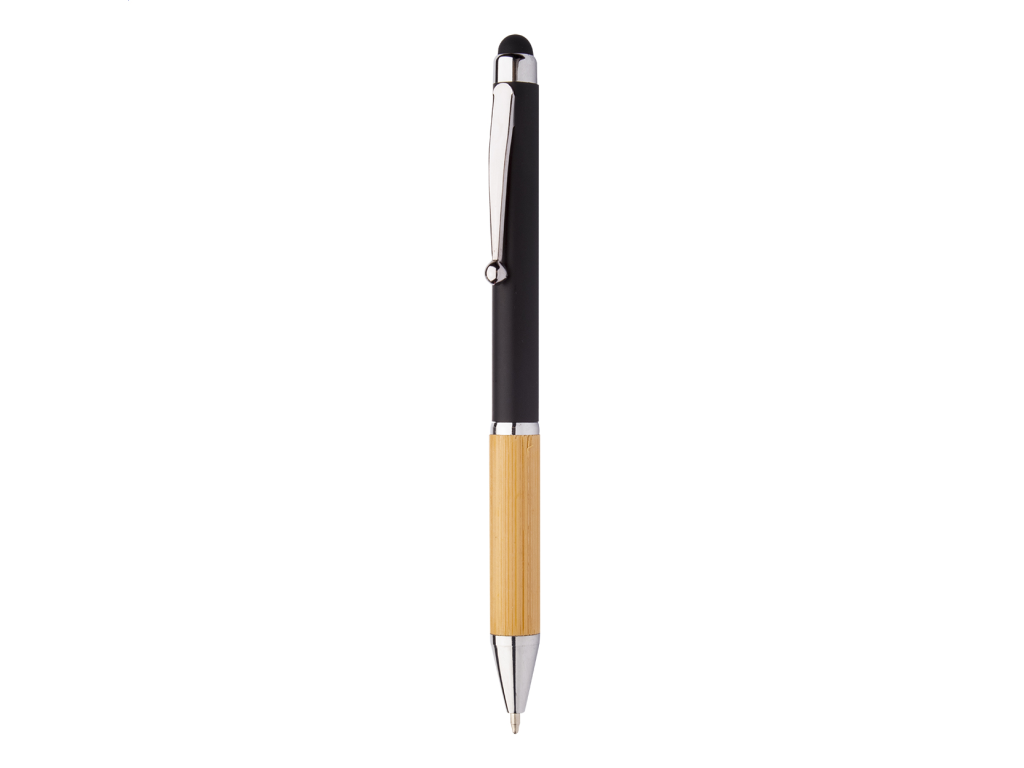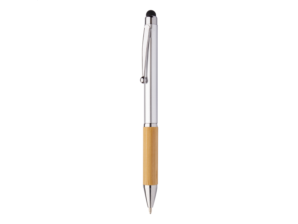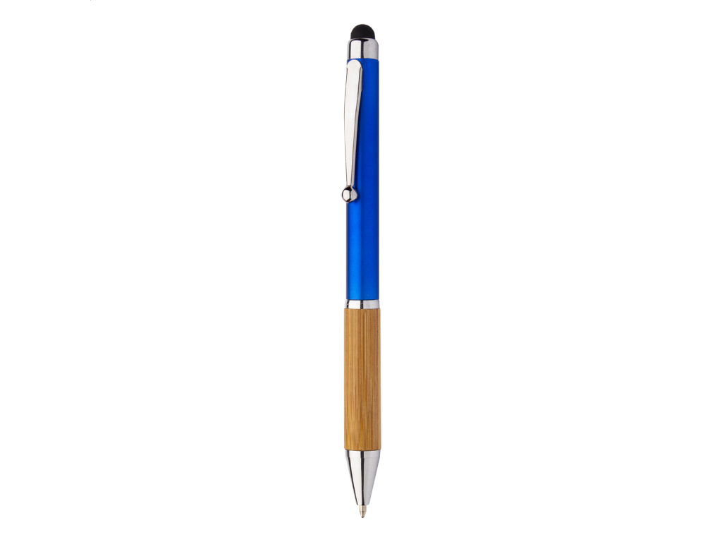 Plastové otočné kuličkové pero s bambusovým úchopem a lesklými chromovanými doplňky s modrou náplní.