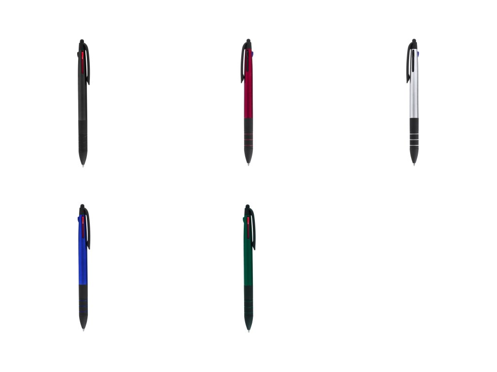 Plastová propiska 3v1, píše , modře, černě a červeně. Úchop je v černé barvě a pogumovaný.