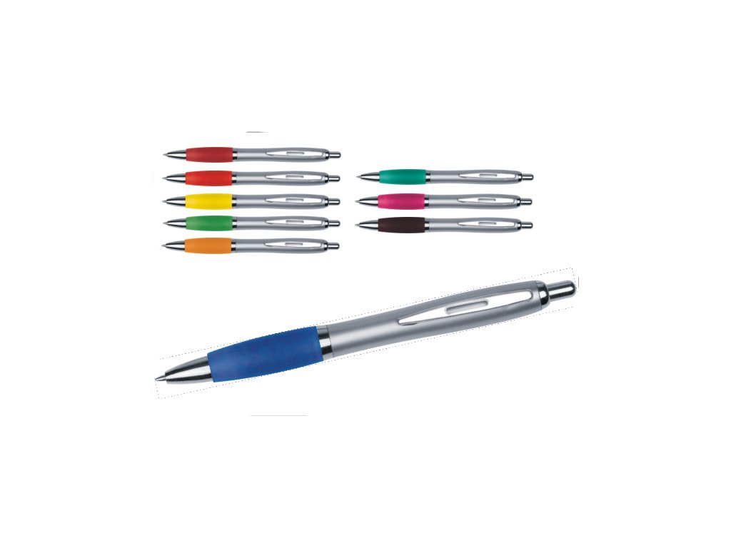 Nejprodávanější propisovací tužka nižší cenové kategorie se stříbrným tělem a barevným gumovým madlem.