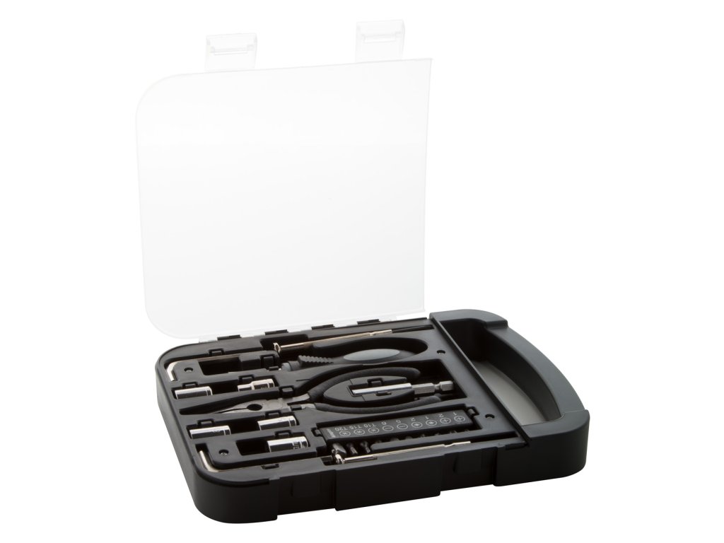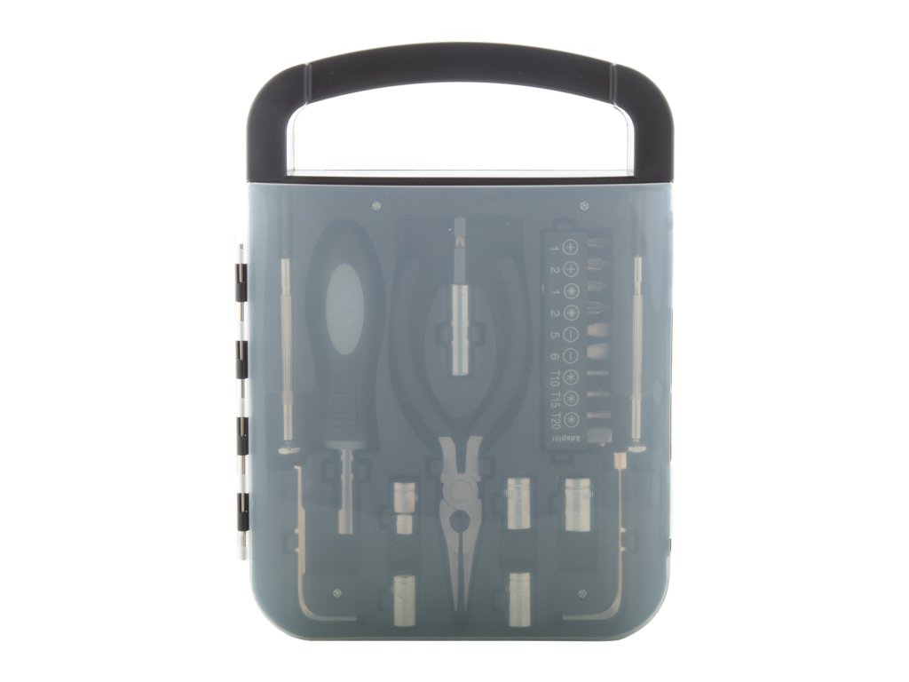 22dílná sada nářadí v plastovém pouzdře. Obsahuje 2ks šroubováků, 1ks kombinovaných kleští, 1 ks držáku, 2 ks dlátek, 5 ks hlavic, 10 ks bitů.