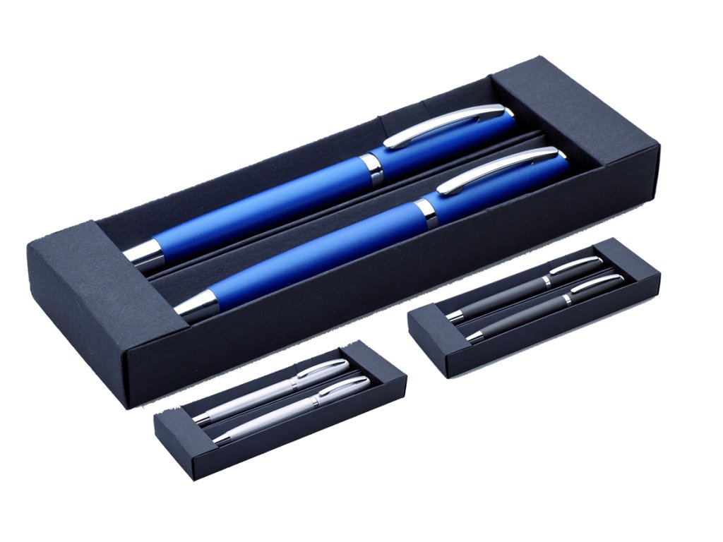 Dárková sada s propiskou a rollerem v černé papírové krabičce.