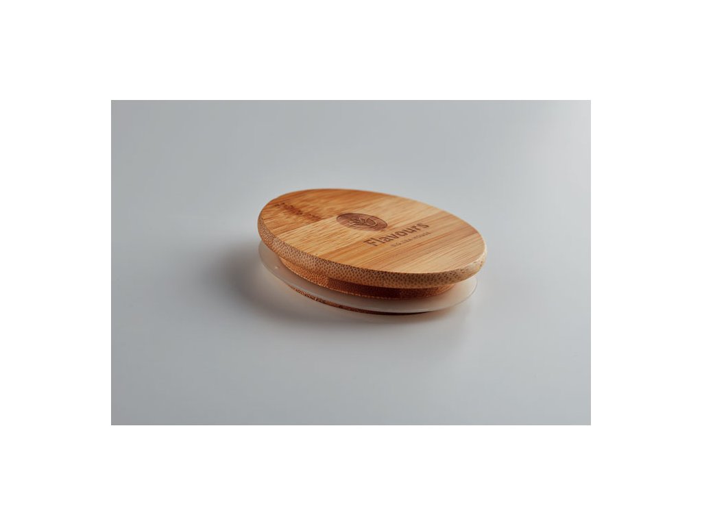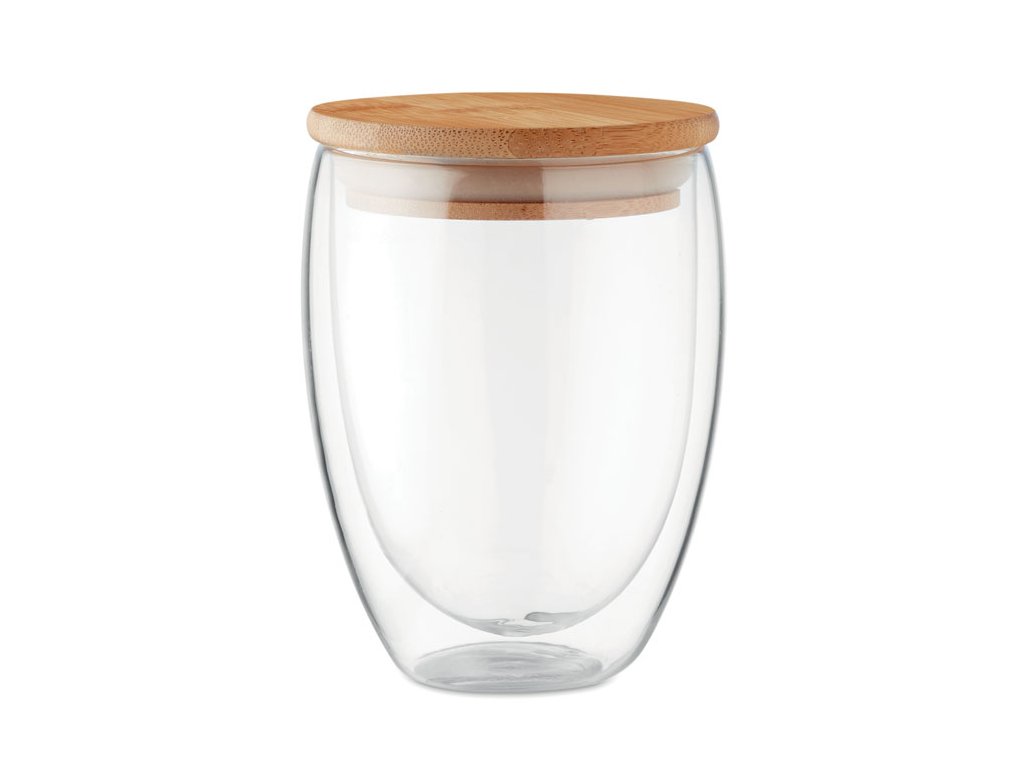 Dvoustěnná sklenice z borokřemičitého skla s krytkou z bambusu se silikonovým kroužkem.