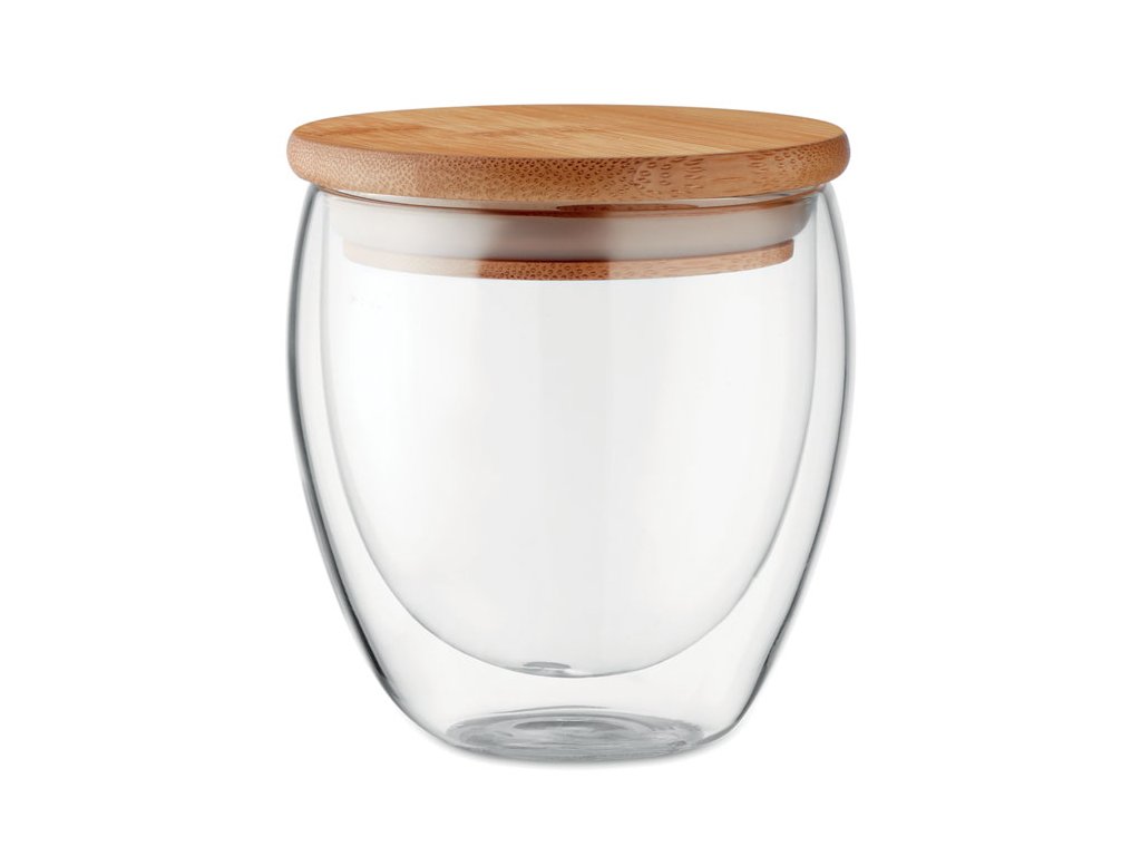 Dvoustěnná sklenice z borokřemičitého skla s krytkou z bambusu se silikonovým kroužkem.