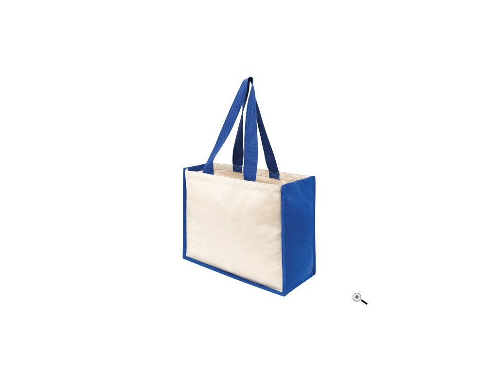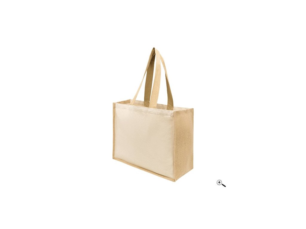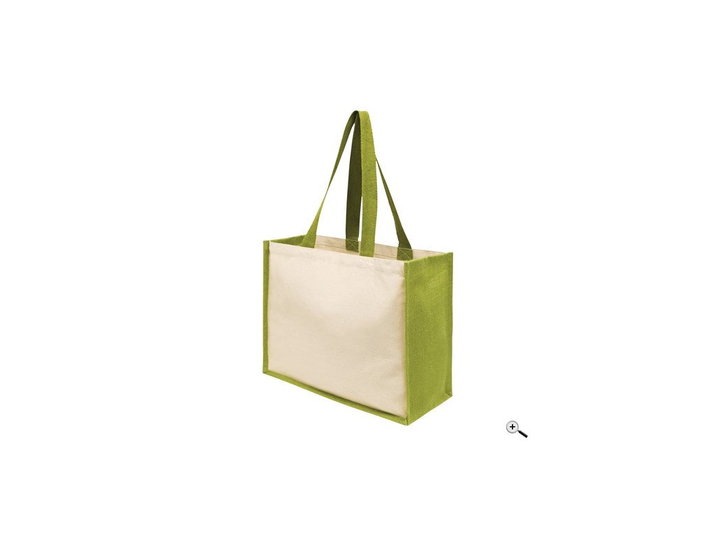 Taška vyrobená z juty a plátna, s dlouhými bavlněnými uchy a barevným lemováním.