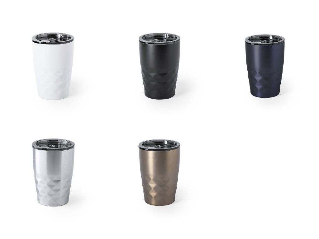 Dvoustěnný nerezový, měděný, vakuově izolovaný termo hrnek s plastovým víčkem na pití.