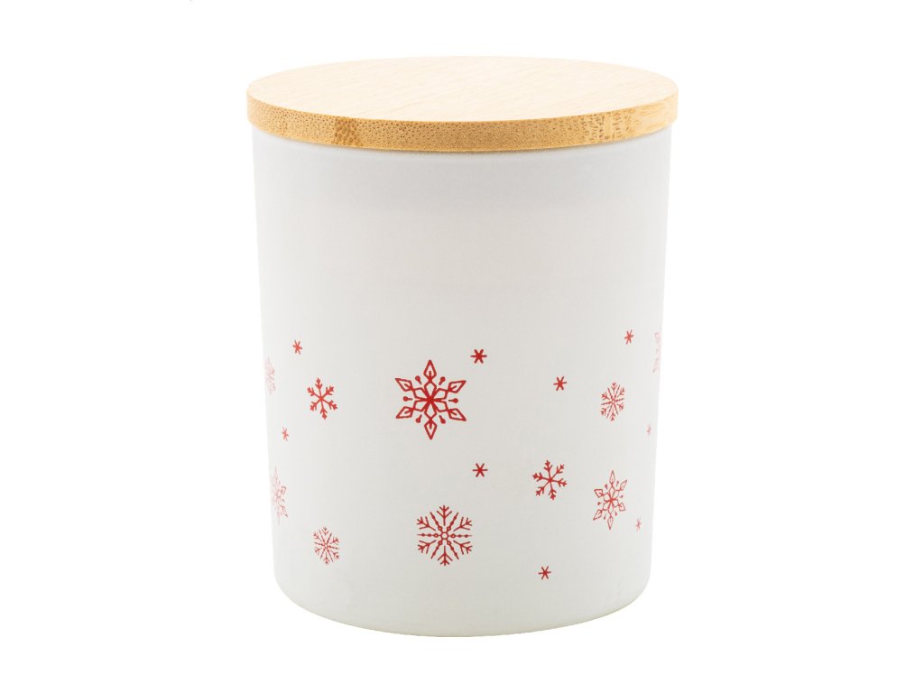 Svíčka s vůní vanilky v matném skleněném svícnu s vánoční ozdobou ve tvaru sněhové vločky a bambusovým víčkem. 120g vosku.