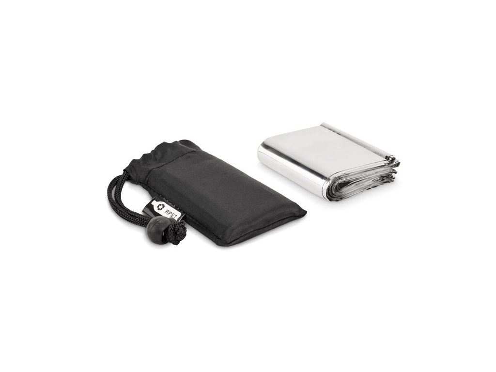 Nouzová isotermická fólie v polyesterovém stahovacím pouzdře z RPET. Rozměr v rozloženém stavu 130 x 210 cm.